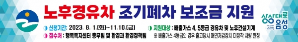 지원 대상 차량은 배출가스 4·5등급 경유 자동차 또는 도로용 3종 건설기계, 지게차, 굴착기이고 신청일 기준으로 사용본거지가 6개월 이상 연속해 음성군에 등록돼 있는 차량이다.