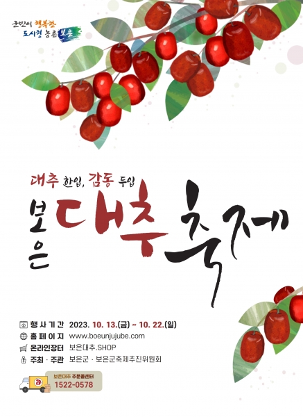2023 보은대추축제는 10월 13일부터 22일까지 10일간 열릴 예정으로 보은군 농·특산물 판매와 더불어 다양한 프로그램과 볼거리를 준비하고 있다.