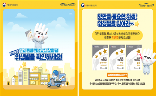 참고로 식약처는 휴가철 국민이 많이 이용하는 다중이용시설 주변의 음식점 위생등급제 지정 활성화를 위해 7월부터 한국식품안전관리인증원과 함께 객석 및 조리장 등 청결관리, 조리기구의 세척·소독 관리 방법 등 음식점 위생관리 기술지원을 실시하고 있다.