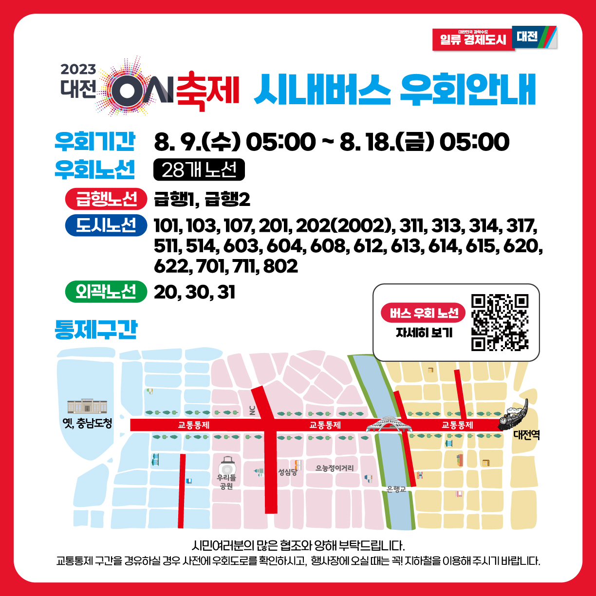 우회하는 버스는 급행1·2번, 101번, 103번 등 통제구간을 경유하는 28개 노선 365대이다. 이들 버스는 오는 8월 9일 새벽 5시부터 18일 새벽 5시까지 대흥로·우암로 등으로 우회하게 된다.