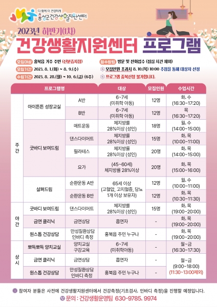 [세종타임즈] 홍성군 건강생활지원센터는 8월 1일부터 9일까지 홍북읍 거주 주민을 대상으로‘하반기 신체활동 프로그램’ 참여자를 모집한다.