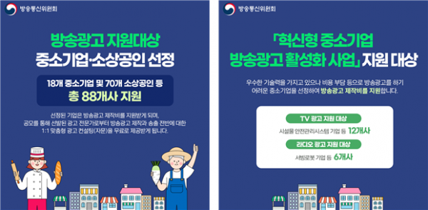 [세종타임즈] 방송통신위원회는 한국방송광고진흥공사와 함께 ‘혁신형 중소기업 방송광고 활성화 지원 사업’과 ‘지역밀착형 방송광고 활성화 기반구축 사업’의 2023년 2차 지원 대상으로 중소기업 18개사, 소상공인 70개사 등 총 88개사를 선정했다.