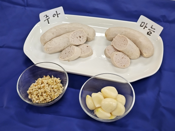 소시지에는 우리군의 특산물인 홍성마늘과 주아, 한돈을 넣어 농산물과 축산물을 융합한 가공제품을 만들어 보았으며 특히 주아를 활용한 소시지는 바로 시제품으로 출시해도 좋을 만큼 풍미와 식감이 뛰어났다.
