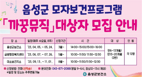 [세종타임즈] 음성군 보건소가 영·유아의 성장발달 및 부모와의 긍정적인 관계 형성을 돕기 위해 제3기 ‘까꿍뮤직’ 영유아 프로그램 대상자를 모집한다.