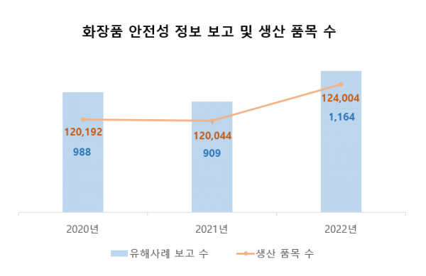 최근 3년간 안전성 보고 건수는 ’20년 988건, ’21년 909건, ’22년 1,164건으로 나타났으며 화장품책임판매업자 수와 화장품 생산 품목 수가 증가함에 따라 안전성 보고도 증가하는 경향을 보였다.
