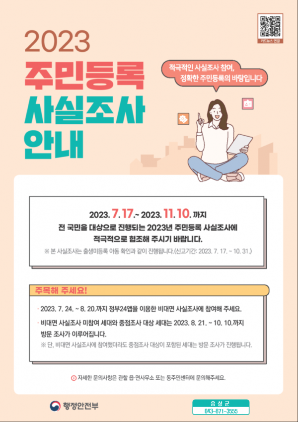 [세종타임즈] 음성군은 전 군민을 대상으로 오는 11월 10일까지 ‘2023년 주민등록 사실조사’를 실시한다.