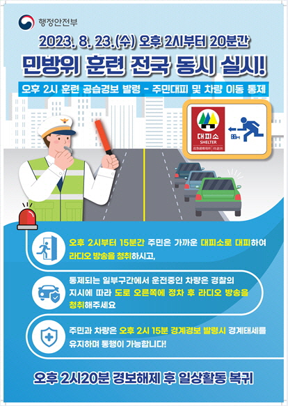 이날 훈련은 오후 2시부터 ‘공습경보발령’, 15분 ‘경계경보 발령’, 20분 ‘경보해제’ 순으로 전국에서 동시 진행된다.