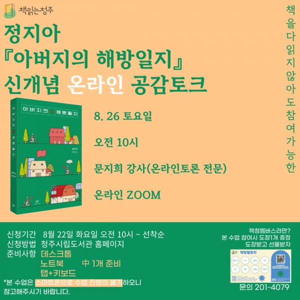 이번 공감토크는 2023년 책읽는청주 성인부문 대표도서로 선정된 정지아 작가의‘아버지의 해방일지’를 주제로 한 북토크이다.