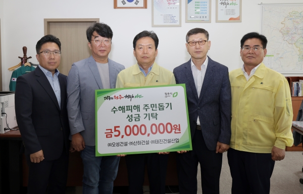 16일 ㈜오성건설, ㈜산하건설, ㈜태진건설산업은 청주시청을 찾아 호우피해로 힘겨운 분들을 위해 써 달라며 성금 500만원을 기탁했다.