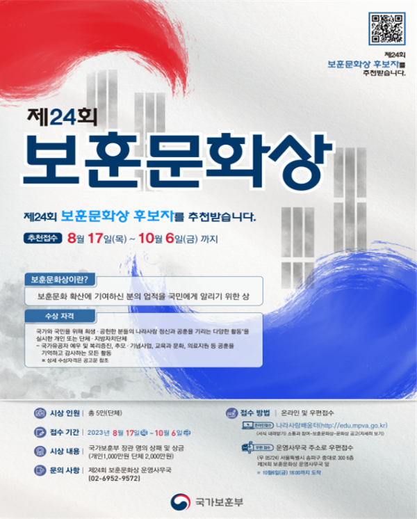 [세종타임즈] 국가보훈부는 17일 “국가를 위해 희생·헌신한 분들의 공헌을 알리고 예우하는 다양한 활동으로 보훈문화 확산에 기여한 개인과 단체 등에 시상하는 ‘제24회 보훈문화상’ 후보자 추천 접수를 10월 6일까지 진행한다”고 밝혔다.