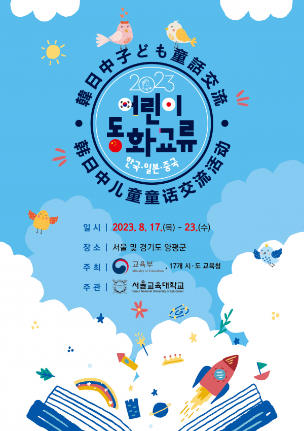 [세종타임즈] 교육부가 주최하고 17개 시도교육청과 서울교육대학교가 공동 주관하는 ‘2023 한·일·중 어린이 동화교류대회’ 가 8월 17일부터 8월 23일까지 서울 및 양평 등지에서 개최된다.