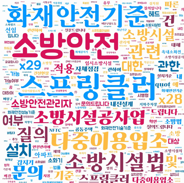질의분야는 소방시설법 4,450건, 화재안전기준 3,540건, 화재안전기준 1,538건, 화재예방법 1,292건, 소방시설공사업법 1,247건, 다중이용업소법 624건, 초고층재난관리법 등 331건 순으로 나타났다.