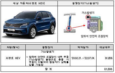 쏘렌토 HEV 81,608대는 앞좌석 안전띠 조절장치의 내부 부품 불량으로 쏘렌토 등 2개 차종 28,858대는 방향지시등 레버 제조 불량으로 각각 8월 16일부터 시정조치에 들어간다.