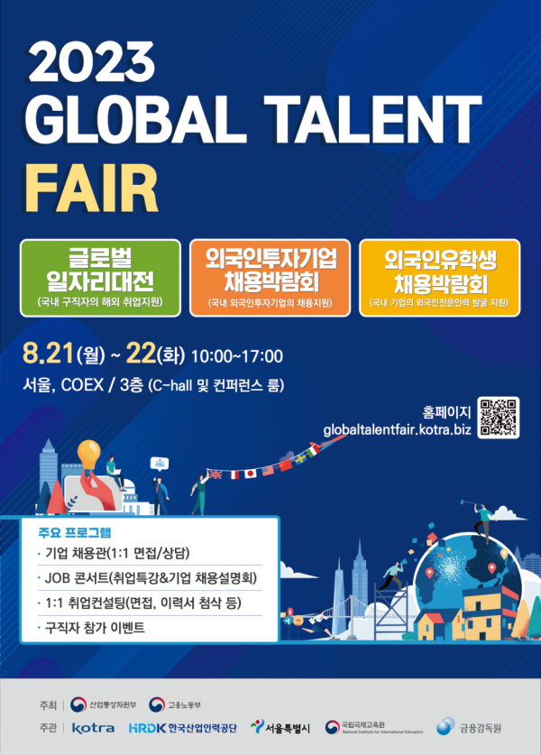 [세종타임즈] 한국산업인력공단은 코트라, 국립국제교육원과 공동 주관하는 ‘2023 글로벌 탤런트 페어’를 서울 코엑스에서 21일 개최한다.