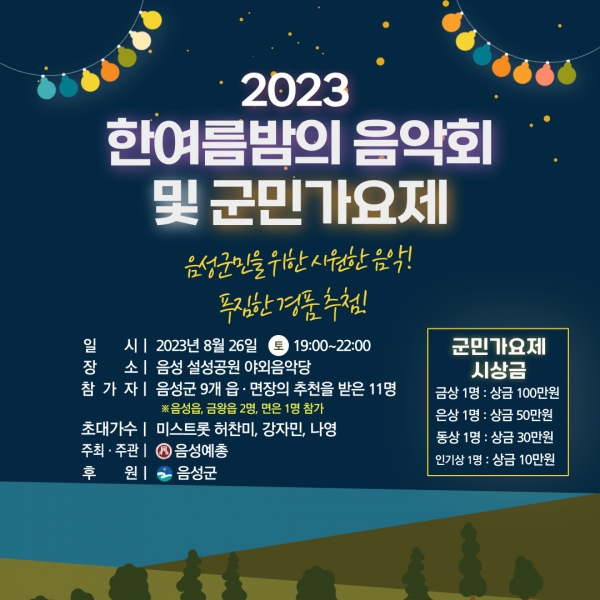 [세종타임즈] 음성군은 오는 26일 오후 7시 음성 설성공원 야외음악당 일원에서 ‘2023 한여름밤의 음악회 및 군민가요제’를 개최한다고 밝혔다.
