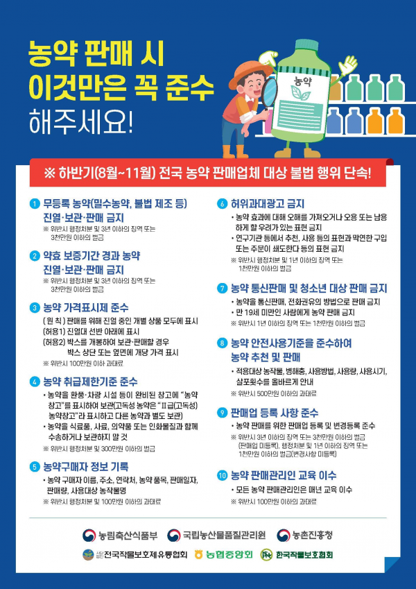 특히 밀수농약, 불법 제조 농약 등 부정농약 취급 약효보증기간 경과 농약과 같은 불량농약 취급 농약 취급제한기준 및 가격표시제 미준수 행위 여부를 집중적으로 살펴볼 계획이며 위반 업체에 대해서는 행정처분, 과태료 부과 등의 조치를 할 예정이다.