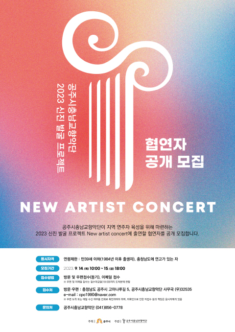 이번 오디션에 합격하는 신진 음악인들은 오는 11월에 있을 새 예술가 콘서트의 무대에서 공주시충남교향악단과의 협연의 기회가 주어진다.