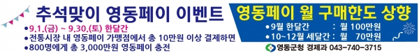 군 관계자는 “지역화폐 특별 이벤트로 소상공인의 매출 증대를 돕고 골목 상권 회복에 도움이 될 수 있길 바란다” 며 “지역화폐인 레인보우영동페이의 많은 관심과 이용을 부탁한다”고 말했다.