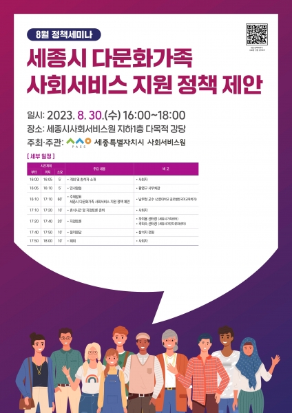 세미나에서는 ‘세종시 다문화 가족 사회서비스 지원 정책 제안’이라는 주제 강연과 현장 전문가의 지정토론 및 청중을 대상으로 하는 자유토론이 진행된다.