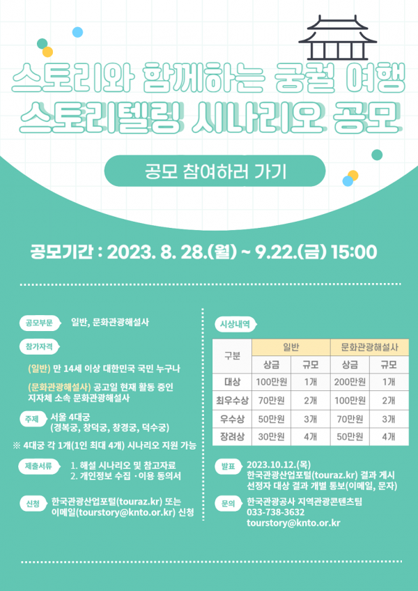 [세종타임즈] 한국관광공사는 8월 28일부터 9월 22일까지 서울 4대궁 소재 고궁 스토리텔링 시나리오 공모전 ‘스토리와 함께하는 궁궐 여행’을 실시한다.