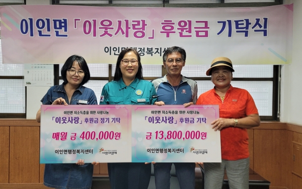 안명 이인면장은 “수해, 폭염 등으로 취약 계층에게 유독 어려웠던 시기에 기부금으로 도움을 드릴 수 있게 되어 기쁘다”며 “이인면을 위해 따뜻한 마음을 전달해주신 기부자님께 큰 감사를 드린다”고 말했다.