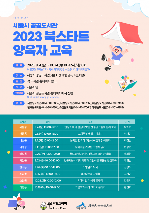 [세종타임즈] 세종특별자치시 공공도서관이 독서의 계절을 맞아 9월부터 10월까지 영유아 부모 및 양육자들을 대상으로 ‘2023년 북스타트 양육자 교육’을 운영한다.