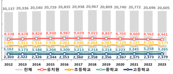 이는 유치원 교원 수 증가에 영향을 받은 것으로 보이며 초·중·고교 교원 수는 440,497명으로 오히려 전년 대비 1,299명 감소했다.