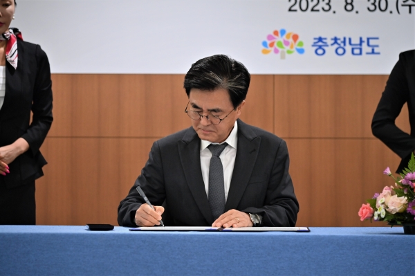 김태흠 지사와 권남주 한국자산관리공사 사장 등이 참석한 가운데 연 이번 협약식은 추진 경위 및 협약 내용 보고 합동 임대 청사 조감도 입체 영상 시청, 협약서 서명 등의 순으로 진행됐다.