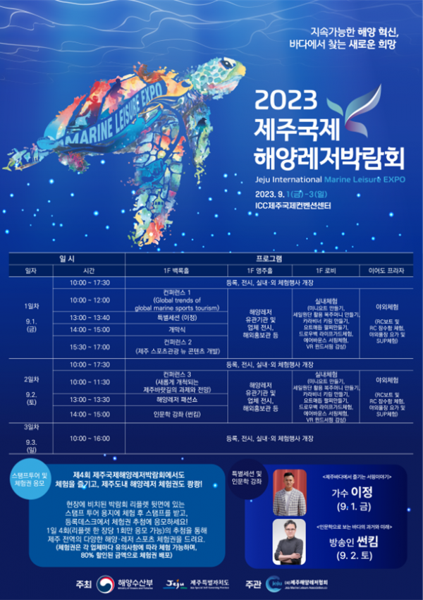[세종타임즈] 해양수산부와 제주특별자치도가 공동 주최하는 ‘제4회 제주국제해양레저박람회’가 9월 1일부터 9월 3일까지 3일간 제주국제컨벤션센터와 제주도 일원에서 열린다.