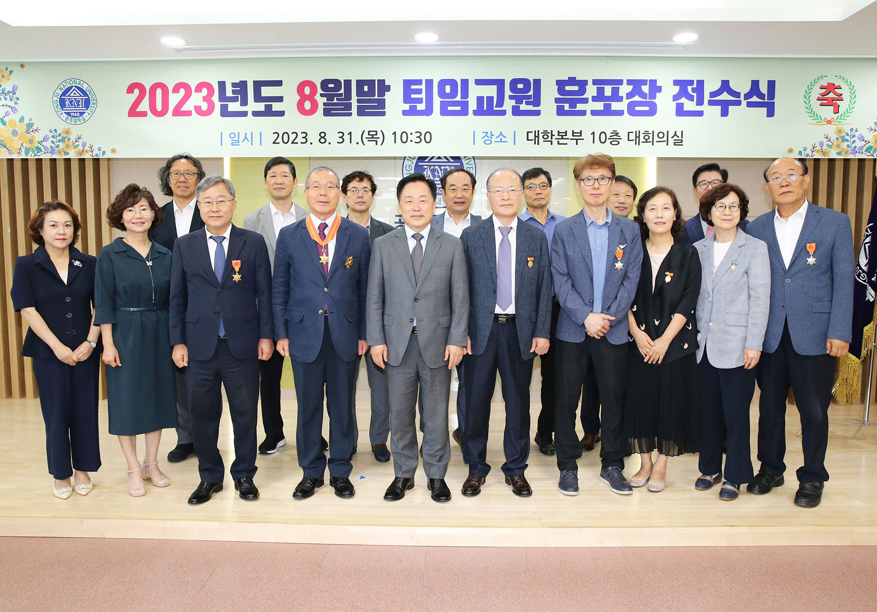 [세종타임즈] 국립공주대학교는 31일 대학본부 대회의실에서 임경호 총장을 비롯한 보직교수, 퇴임교원 및 가족 등 내외빈이 참석한 가운데 2023년도 8월말 퇴임교원 훈포장 전수식 행사를 가졌다. 공주대 8월말 퇴임교원은 22명이다. 이날 황조근조훈장에 정종인 교수, 녹조근정국립공주대학교(총장 임경호)는 31일 대학본부 대회의실에서 임경호 총장을 비롯한 보직교수, 퇴임교원 및 가족 등 내외빈이 참석한 가운데 2023년도 8월말 퇴임교원 훈포장 전수식 행사를 가졌다. 공주대 8월말 퇴임교원은 22명이다. 이날 황조근조훈장에 정종인 교수, 녹조근정훈장 김창성 교수, 근정포장에 송창빈, 홍사용 교수, 대통령표창에 모선희, 박원태 교수, 국무총리표창에 강희숙 교수 등이 각각 훈포장과 표창장을 받았다.