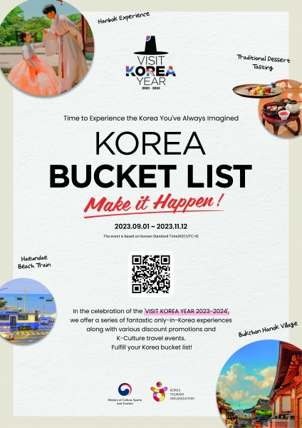 [세종타임즈] 문화체육관광부와 한국관광공사는 ‘2023~2024 한국방문의 해’를 기념해, 지난 1일부터 오는 11월 12일까지 방한 외국인 관광객이 K-팝, 뷰티, 푸드 등 다양한 한국의 매력을 경험할 수 있는 ‘코리아 버킷리스트’ 온오프라인 프로모션을 추진하고 있다.