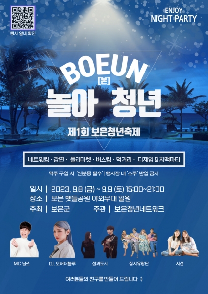 [세종타임즈] 보은군은 오는 8일과 9일 양일간 보은읍 뱃들공원 일원에서 보은군 청년들을 위한 첫 축제인 ‘놀아 BEOUN 청년’축제가 개최한다고 밝혔다.