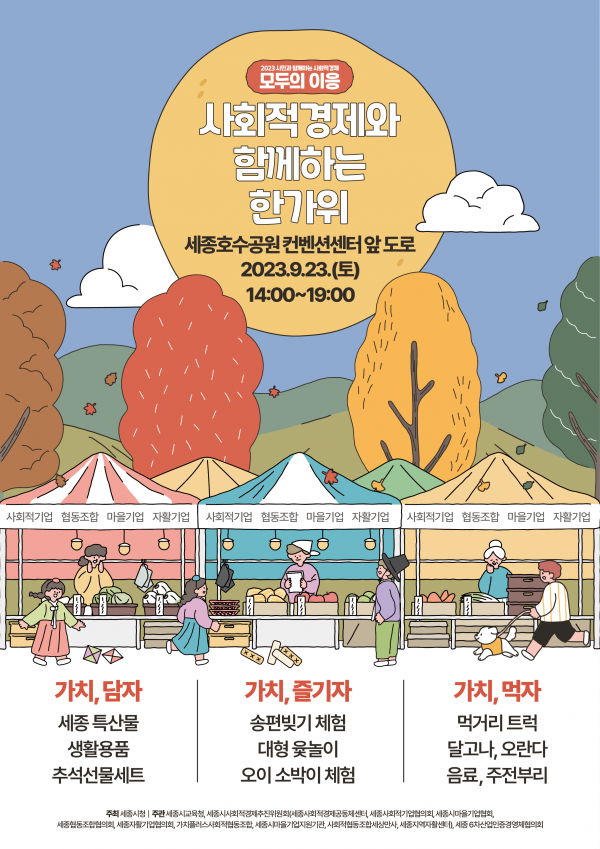 [세종타임즈] 세종특별자치시가 주최하고 세종시사회적경제추진위원회가 주관하는 사회적경제 ‘모두의 이응’ 행사가 민족의 대명절 추석을 앞두고 오는 23일 세종컨벤션센터 앞 도로에서 열린다.