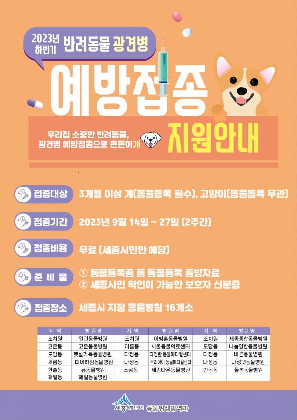 [세종타임즈] 세종특별자치시가 반려동물의 야외활동이 많아지는 가을철을 맞아 광견병 예방접종을 무료로 지원한다.