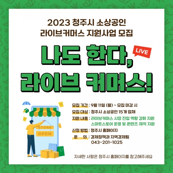 [세종타임즈] 청주시는 민선8기 공약사업의 일환으로 청주시에 소재한 소상공인의 다양한 판로 개척을 지원하고 온라인 역량을 강화하고자, ‘청주시 소상공인 라이브커머스 지원사업’참여자를 모집한다고 11일 밝혔다.