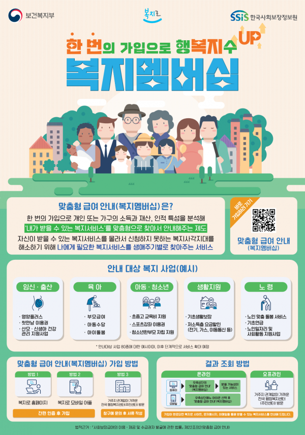 복지멤버십 가입자는 기초연금, 부모급여, 에너지바우처 등 80종의 복지서비스 중 가구의 소득·재산, 연령, 장애 여부, 출산 등 가구 특성에 따라 받을 수 있는 복지서비스를 문자, 복지로 등을 통해 안내받을 수 있다.