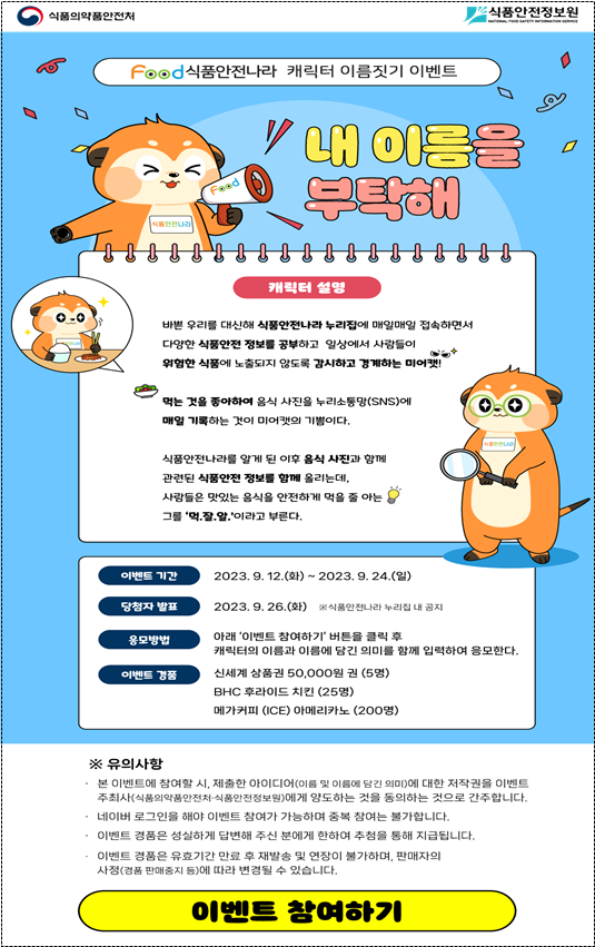 [세종타임즈] 식품의약품안전처와 식품안전정보원은 9월 12일부터 9월 24일까지 식품안전나라 캐릭터의 이름 공모전을 개최한다.