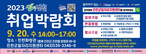 [세종타임즈] 진천군은 오는 9월 20일 오후 2시부터 진천 화랑관에서 ‘2023 희망 job fair 내일을 JOB아라’라는 주제로 생거진천 취업박람회를 개최한다고 14일 밝혔다.