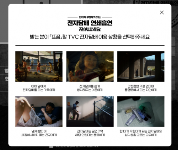 보건복지부 금연 캠페인 누리집에 방문해 흡연자가 전자담배의 중독성을 인지할 만한 광고 장면을 선택하고 응원 메시지와 함께 전송하는 방식으로 비흡연자, 흡연자 모두 참여할 수 있다.