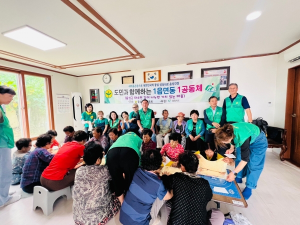 충청북도에서 지원하는 1읍면동-1공동체 사업을 위해 회원 27명이 모여 관내 경로당 2개소를 방문해 간식봉사 등 어르신들께 따뜻한 마음을 전하는 행사를 진행했다.