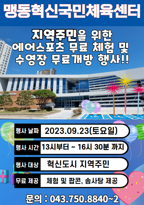 행사와 관련해 자세한 문의는 맹동혁신국민체육센터 수영장으로 문의하면 된다.