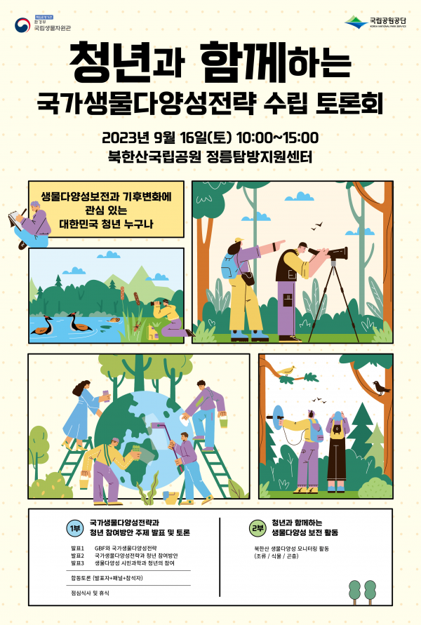 [세종타임즈] 환경부 소속 국립생물자원관은 국립공원공단과 함께 9월 16일 북한산국립공원 정릉탐방지원센터에서 ‘청년과 함께하는 국가생물다양성전략 수립 토론회’를 개최한다.