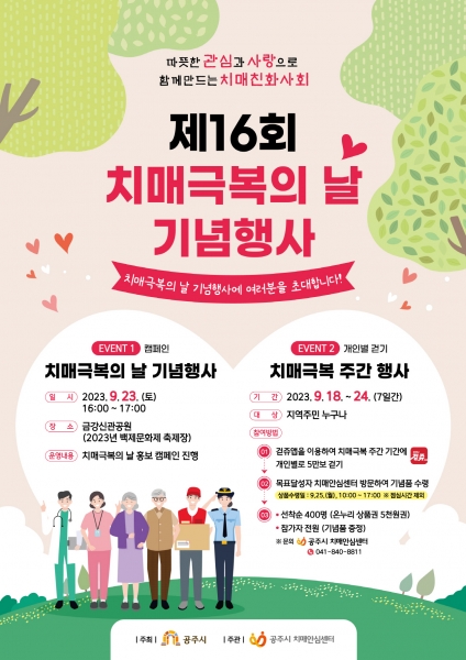 [세종타임즈] 공주시는 제16회 치매극복의 날을 맞아 오는 23일 금강신관공원에서 치매극복 캠페인을 진행한다고 15일 밝혔다.