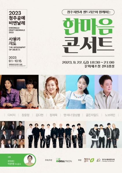 청주시민과 셀트리온이 함께하는 ‘한마음 콘서트’는 22일 오후 7시, 2023 청주공예비엔날레가 열리는 문화제조창 야외 광장에서 화려한 막을 올린다.