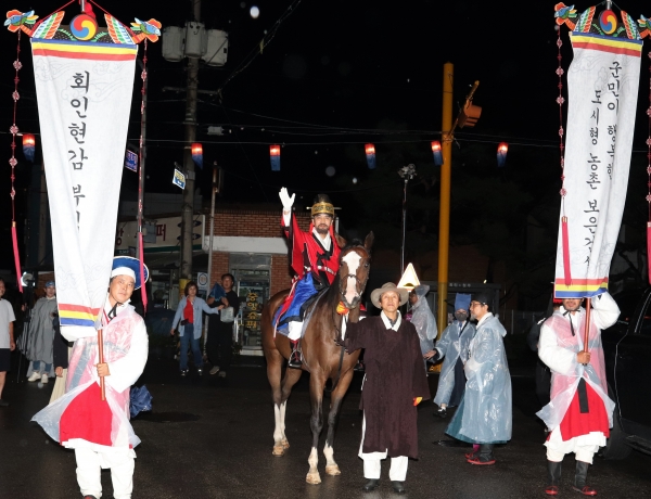 아울러 중앙로에서 펼쳐진 회인현감 행렬은 보덕중학교 취타대가 행렬을 선도하고 최재형 보은군수가 현감으로 회인면 이장, 부녀회 등 많은 주민들이 분장을 하고 행렬에 참여해 약 120여년 만에 실제 현감이 행차하는 모습을 재현했다.