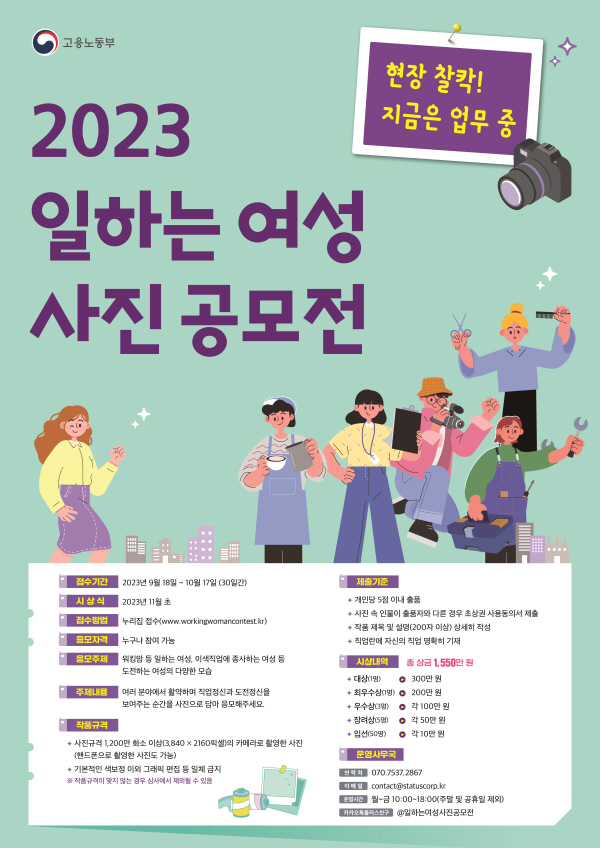 이정한 고용정책실장은 “여성의 경제활동 참여 확대는 개인에게 중요한 의미가 있을 뿐만 아니라, 생산인구 감소라는 국가적 위기를 돌파하고 성장 잠재력을 강화하는데 반드시 필요한 국가적 과제이다”고 강조하며 “이번 사진 공모전을 통해 일하고 싶어도 선뜻 용기를 내지 못하고 있는 여성들에게 용기를 주고 여성들이 새롭게 도전할 수 있는 분야가 더 넓고 다양하다는 점을 알릴 수 있는 계기가 되길 바란다”고 밝혔다.