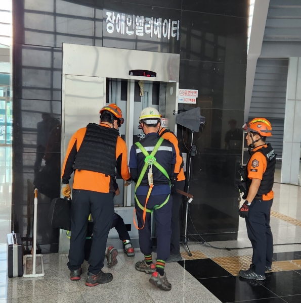 이날 정전으로 인한 승강기 이용객 갇힘 상황을 설정해 사고 발생부터 이용객 구조요청 관리주체 초기대응 119구조대와 유지관리업체 현장 출동 승객 구조 순으로 실제 사고 발생 시 대응 순서와 동일하게 진행됐다.