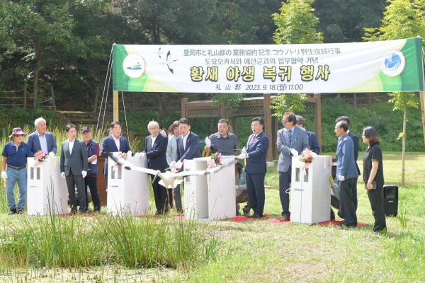 최재구 예산군수는 “이번 협약으로 우리 예산군과 일본 도요오카시가 복원사업의 동반자로 상호 협력 체제를 유지하고 정보를 공유해 멸종된 황새가 전 세계 곳곳으로 비상하는데 기여할 것으로 기대한다”고 말했다.