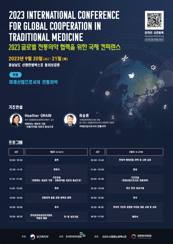 이번 학술대회에서는 호주 로열멜버른공과대학교 헤더 그레인 교수가 ‘변화하는 세상의 기회 - 전통의약을 의료의 중심으로’를 주제로 국제동양의학회 최승훈 회장이 ‘미래산업으로서의 전통의약’을 주제로 기조연설을 한다.