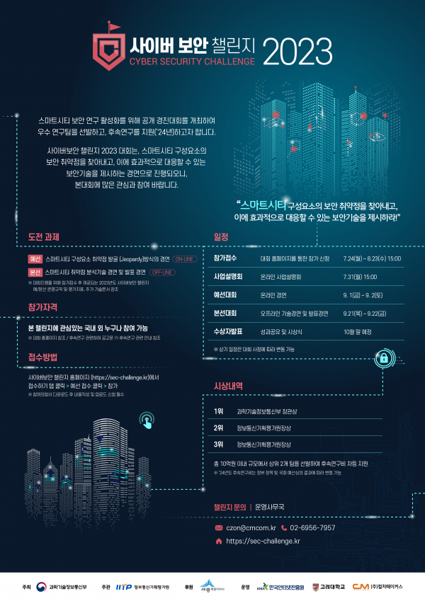 이에 ‘스마트시티 구성요소의 보안 취약점 발굴’을 주제로 ‘2023 사이버보안 챌린지 대회’를 개최하게 됐다.
